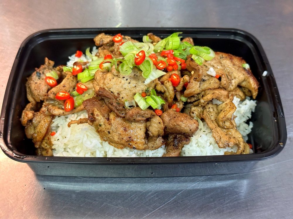 Stir-Fried minced chicken with bell peppers, basil leaves. Served with Jasmine rice.