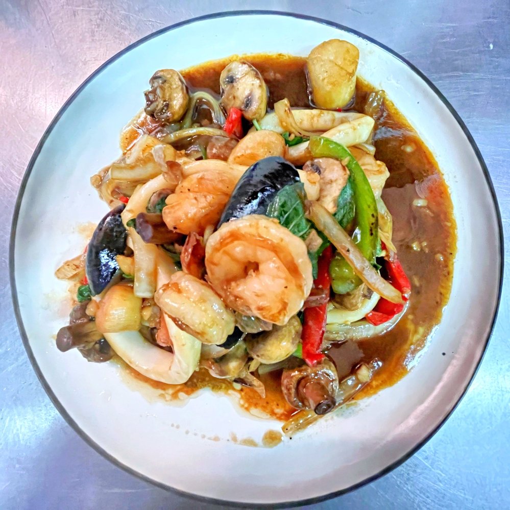 Stir-fried, onion, bell pepper, mushroom, basil leaves, garlic, Thai chili in spicy house sauce.