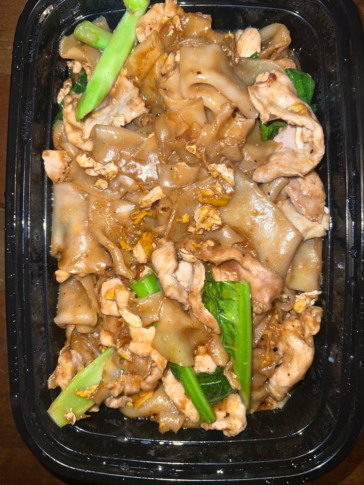 Stir-fried wide rice noodles with your choice of protein, egg, and Chinese broccoli in Thai sweet soy sauce (contains oyster sauce). Be sure to purchase utensils if you'll need them (from the cutlery option).