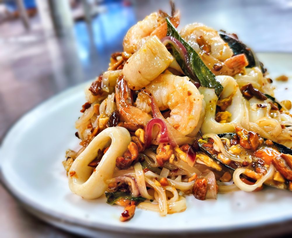 This dish is made with stir-fried rice noodles, shrimp, squid, scallops, mussels, eggs, red onion, turnip, basil leaves, and ground peanuts. It's a delicious and healthy combination of flavors and textures.