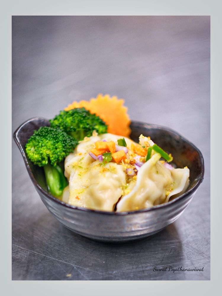 Deep-fried chicken and vegetables potstickers served with ginger sauce.
