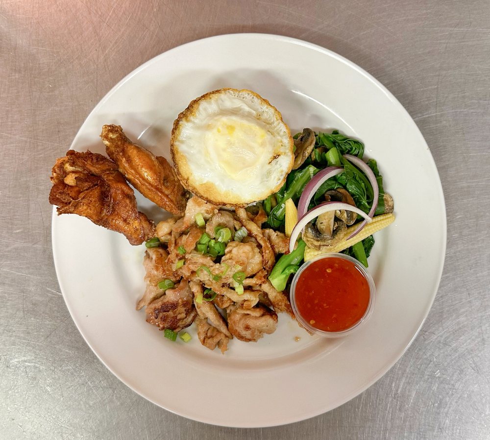 Stir-fried minced chicken with garlic, Thai chili, bell peppers, and basil leaves. Be sure to purchase utensils if you'll need them (from the cutlery option).
